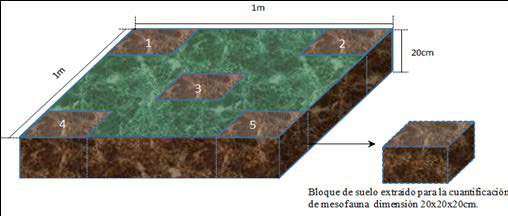 En cada sitio de muestreo se realizó 5 mediciones, distribuidas una en cada esquina y una en el centro del cuadrante, cada bloque de suelo analizado dentro de la muestra fue de 20 cm x 20 cm y por 20 cm de profundidad, dando un total de 100 cuantificaciones de mesofauna por área de estudio, según se describe en la figura 2.
