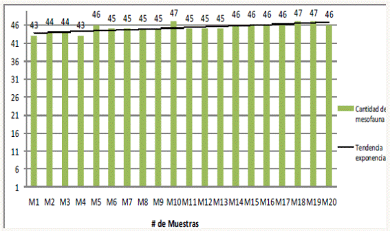 Con la ayuda del sistema informático se observó que: en las muestras cercanas al punto de aplicación de la microsísmica, la presencia de mesofauna es mucho menor respecto a las muestras subsiguientes; es decir conforme el conteo se aleja del punto central donde realizaron las actividades de microsísmica, la mesofauna aumenta en cantidad, según se observa en la figura 5.