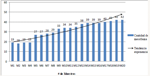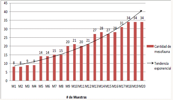 La cuantificación de la mesofauna edáfica en las tres áreas de estudio se realizó empezando por los sitios próximos a los puntos de intersección de los transectos, es decir desde la muestra M1 de manera consecutiva hasta la muestra M20.