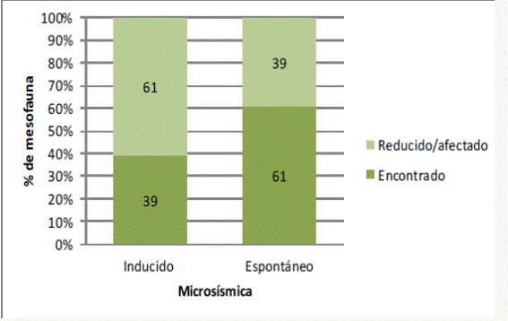 La diferencia porcentual de afectación o reducción a la mesofauna edáfica según las variedades estudiadas, en las áreas de aplicación de las técnicas del Efecto Inducido y del Efecto Espontáneo, de la microsísmica son: arácnidos el 25%, ciempiés 20% y lombrices el 27% de reducción en la técnica del Efecto Inducido.