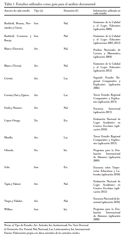 A lo largo del presente artículo se integraron otras publicaciones que también abordaron el logro académico de estudiantes mexicanos, pero sólo cumplen parcialmente los demás requisitos mencionados; estas publicaciones son importantes para complementar el análisis, puesto que aportan datos para reforzar o contrastar los hallazgos.
