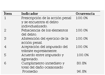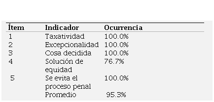 En cuanto a los otros criterios que obtienen un 100% de aplicación en los casos analizados que son la excepcionalidad, la cosa decidida y la acción de evitar que se lleve a cabo el proceso penal, se puede decir que su aplicación ha sido la correcta, tanto desde el planteamiento expresado por el Fiscal; siendo estos criterios coherentes para el caso de la excepcionalidad lo expresado por Sánchez Rubio & D’Azevedo Reátegui, (2014) que indican, que este proceso busca la celeridad de la determinación judicial, correspondiendo a una evidencia práctica observada en todos los casos evaluados, donde mayoritariamente las sentencias terminan con el irrestricto cumplimiento de los adeudos de la demanda a favor del niño en plazos razonables y de forma expeditiva.