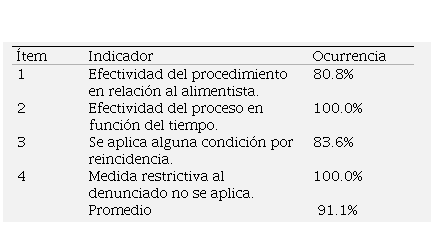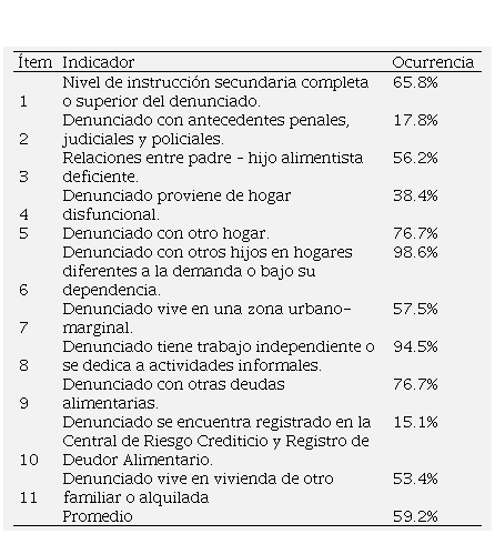 Los indicadores que mayor valoración tienen, siendo estos incluso muy cercanos al 100% de ocurrencia son el denunciado con otros hijos en hogares diferentes a la demanda o bajo su dependencia con 98.6% y denunciado tiene trabajo independiente o se dedica a actividades informales con 94.5%. Un segundo grupo podemos agruparlos a los siguientes indicadores: denunciado con otras deudas alimentarias con 76.7%; denunciado con otro hogar con 76.7%; Nivel de instrucción secundaria completa o superior del denunciado con 65.8%; Denunciado vive en una zona urbano-marginal con 57.5%; Relaciones entre padre – hijo alimentista deficiente con 56.2%. Un tercer grupo de indicadores, que son aquellos cuya ocurrencia es relativamente baja, son Denunciado con antecedentes penales, judiciales y policiales con 17.8%; Denunciado se halla registrado en la Central de Riesgo Crediticio y Registro de Deudor Alimentario con 15.1%.
