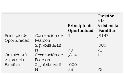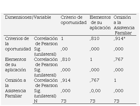 Los valores de la correlación entre las dimensiones del Principio de Oportunidad con el delito de omisión de la asistencia familiar, al mostrar valores positivos superiores a 0.7; e incluso en uno de ellos un valor superior a 0.9, nos indica que existe relación proporcionalmente directa, es decir a mejor nivel de aplicación de los criterios de la oportunidad del principio, o de los elementos de su aplicación, mejores serán los resultados en la determinación de la decisión en el delito de Omisión a la Asistencia Familiar; y a la luz de los resultados podemos inferir que este principio se aplica en el 100% de los casos analizados, y el nivel de logro del pago de la pensión alimenticia es igual al 100%, aun cuando este pago no ocurra en su totalidad al momento de arribar al acuerdo, siendo este valor del 80.8%, por tanto la relación obtenida guarda coherencia con los resultados explicados en la investigación.