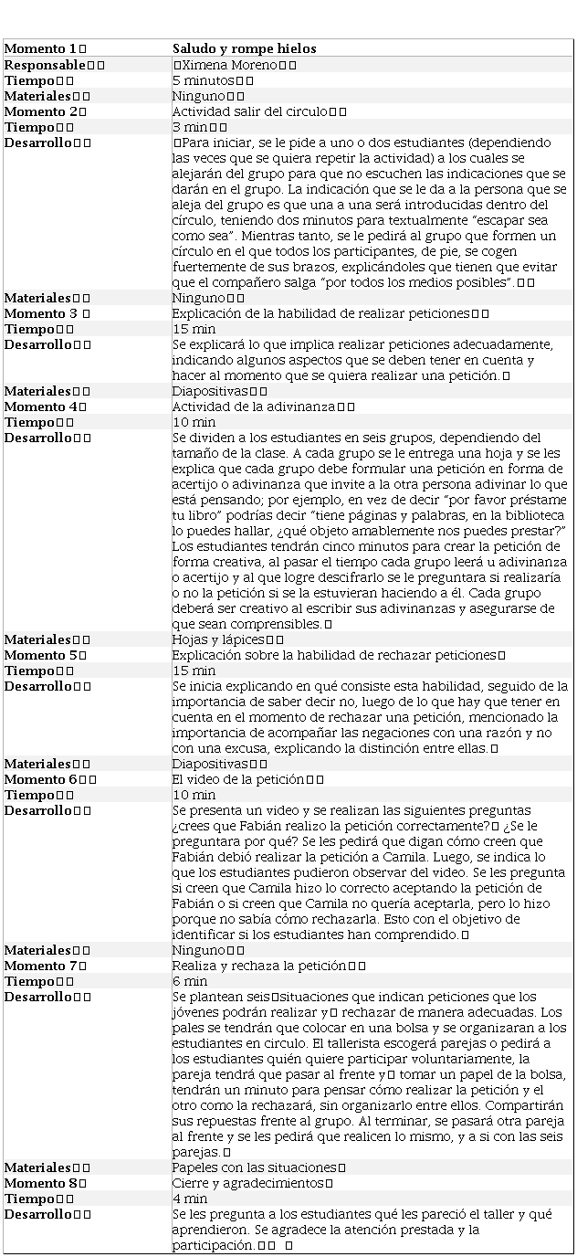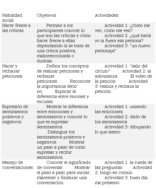 En la tabla 1 se encuentran las actividades y acciones realizadas en los talles de acuerdo con la habilidad social y el objetivo determinado.