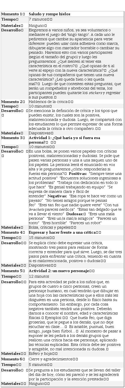 Justificación: este taller proporciona a los participantes herramientas prácticas para la expresión y el afrontamiento de las críticas, con el objetivo de que los estudiantes logren generar relaciones saludables y disminuir los conflictos, distinguiendo entre una crítica positiva, malintencionada y dudosa. Les permite aprender a dominar la reacción frente a ella y realizar una expresión sin la intención de hacer daño a otra persona.