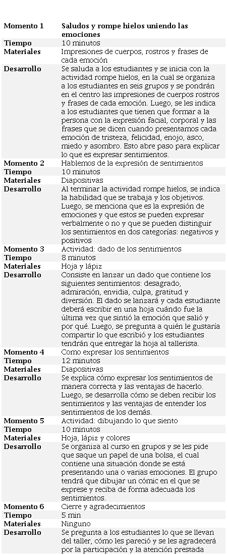 Justificación: La expresión de sentimientos es una habilidad social crucial para el bienestar personal y la construcción de relaciones saludables. Por esto, este taller proporciona herramientas necesarias para expresar sus emociones de manera efectiva, fomentando un ambiente escolar más compasivo y colaborativo. La capacidad de comunicar emociones no solo fortalece las relaciones entre compañero, sino que contribuye al desarrollo integral, preparándolos para enfrentar desafíos sociales con compresión y respeto.