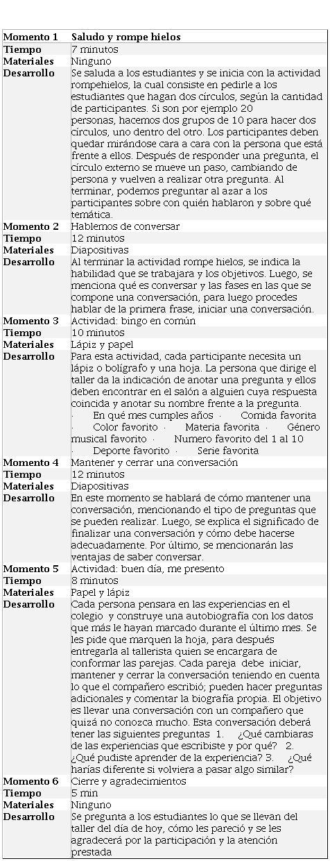 Justificación: En la dinámica del entorno escolar, la habilidad social del manejo de conversaciones es esencial para el crecimiento personal, ya que es necesaria para comunicarse de manera clara, escuchar activamente y resolver conflictos de manera constructiva. Al trabajar esta habilidad social, se fortalece la capacidad para participar en diálogos significativos, mejorando la calidad de las relaciones sociales y contribuir a tener comunicadores eficaces, escuchando y aceptando otros puntos de vida.