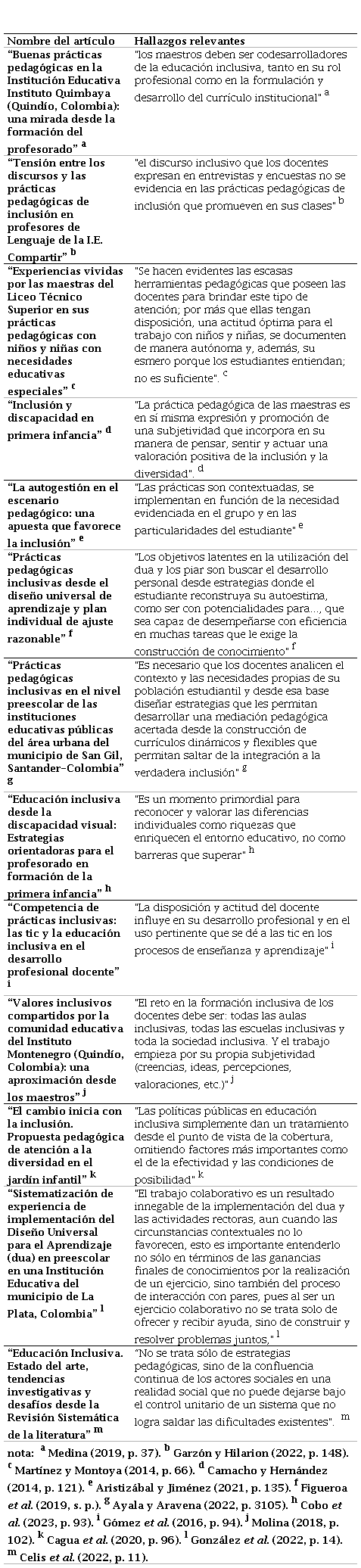 Uno de los hallazgos relevantes es que los autores, más que hablar de una educación inclusiva, identifican como escenario importante la cultura inclusiva que hace referencia a las creencias, los valores y a los factores sociales, los cuales influyen en la concepción de inclusión (Medina, 2019; Garzón y Hilarión, 2022; Martínez y Montoya, 2014; Camacho y Hernández, 2014; Aristizábal y Jiménez, 2021; Ayala y Aravena 2022; Cobo et al., 2023; Laiton et al. 2016; Molina, 2018; Cagua, 2020; Celis et al., 2022). La formación docente evidencia la necesidad de una cualificación constante y creación de espacios de aprendizaje para el abordaje de las necesidades y diversidades de los estudiantes (Medina, 2019;Martínez y Montoya, 2014; Ayala y Aravena, 2022; Cobo et al., 2023; Laiton et al., 2016; González et al., 2022; Celis et al., 2022). En las políticas públicas se reconoce su existencia, sin embargo, se requiere un accionar continuo y eficaz para garantizar su cumplimiento (Garzón y Hilarión, 2022; Ayala y Aravena, 2022; Cagua, 2020; Celis et al., 2022).