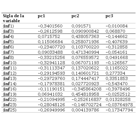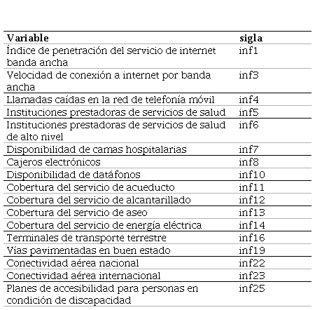 En el segundo componente las variables de mayor contribución son llamadas caídas en la red de telefonía móvil (inf4), instituciones prestadoras de servicios de salud (inf5), disponibilidad de camas hospitalarias (inf7), cobertura del servicio de aseo (inf13) y terminales de transporte terrestre (inf16). Esto sugiere que el componente 2 está más vinculado con la calidad y cobertura de los servicios básicos y de salud.