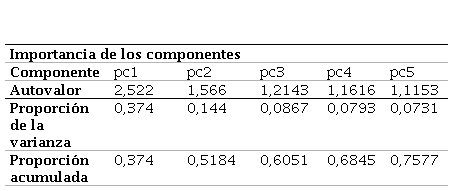 Teniendo en cuenta solo los autovalores mayores a 1, la tabla 2 muestra la importancia de los cinco primeros componentes para el 2018. En ella se observa que los dos primeros componentes (pc1 y pc2) explican la mayor parte de la varianza de los datos relacionados con infraestructura del turismo sostenible (51,84 % en conjunto). Por su parte, el tercer, cuarto y quinto componente (pc3, pc4 Y pc5) explican el 8,67 %, 7,93 % y 7,31 %, respectivamente. En total, estos cinco componentes explican el 75,77 % de la variabilidad de los datos de infraestructura relacionados con el turismo sostenible en Colombia durante 2018.