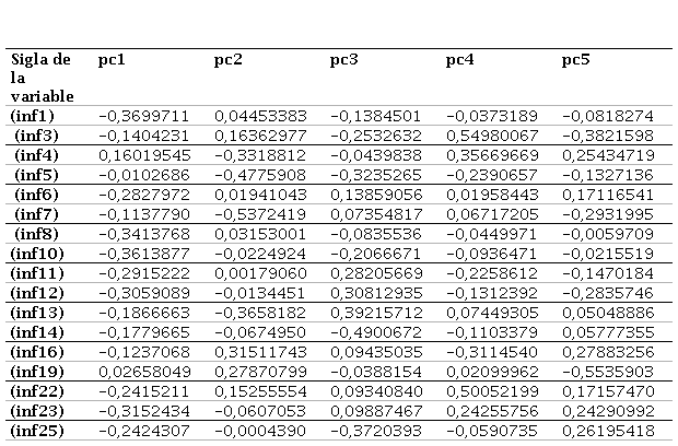 En el cuarto componente, las variables más relevantes son velocidad de conexión a internet por banda ancha (inf3), llamadas caídas en la red de telefonía móvil (inf4) y conectividad aérea nacional (inf22). Esto sugiere que el componente 4 se encuentra más relacionado con la calidad de la conectividad tecnológica y el transporte nacional.