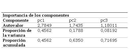 Teniendo en cuenta solo los autovalores mayores a 1, la tabla 3 muestra la importancia de los tres primeros componentes para el 2023. En ella se observa que el primer componente (pc1) explica la mayor parte de la varianza de los datos relacionados con la infraestructura del turismo sostenible (45,62 %). Por su parte, el segundo (pc2) y tercer componente (pc3) explican el 17,88 % y 8,1 %. En conjunto, estos tres componentes explican el 71,69 % de la variabilidad de los datos relacionados con el turismo sostenible en el ambito de la infraestructura en Colombia.