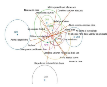Una alta correlación entre los profesores que no ausentan de clase por problemas de la voz, con aquellos que han asistido a cursos relacionados con este tema y son ellos quienes no han padecido una enfermedad que afecte a su voz y que a su vez consideran que tienen un volumen de voz adecuado, sin embargo se fatigan al hablar. Dentro de este grupo se encuentran en su mayoría profesores del Bachillerato 2, Ciencias de la Educación y Medicina.
