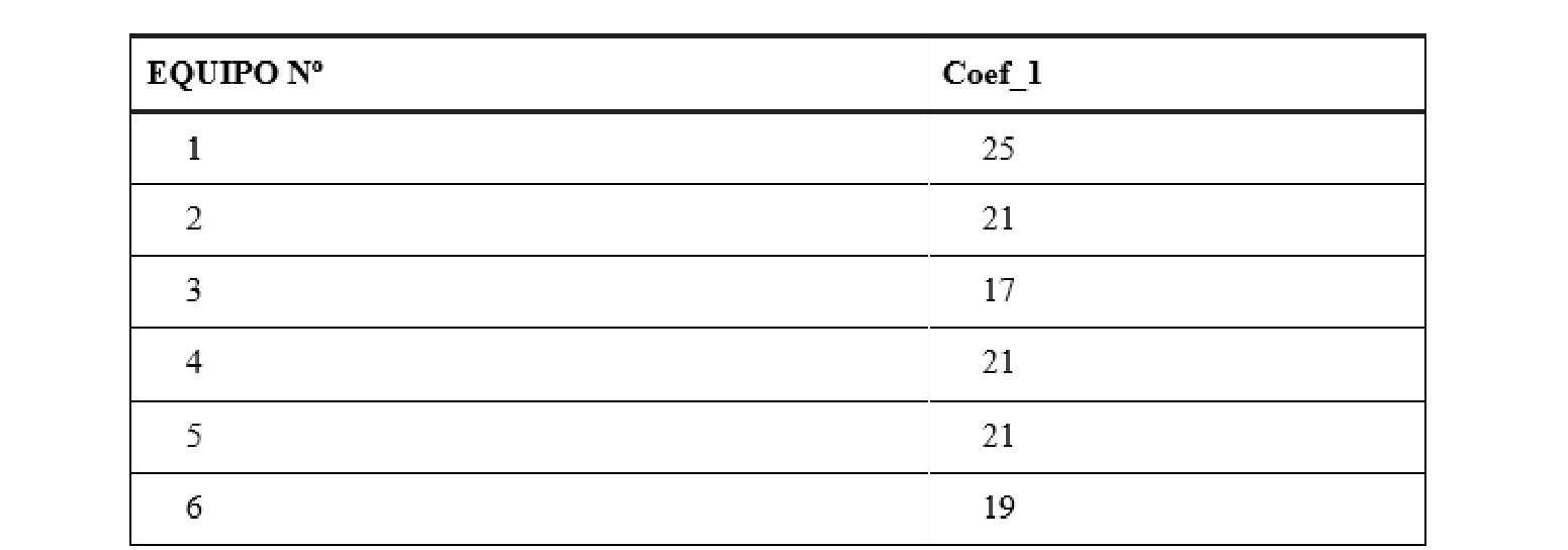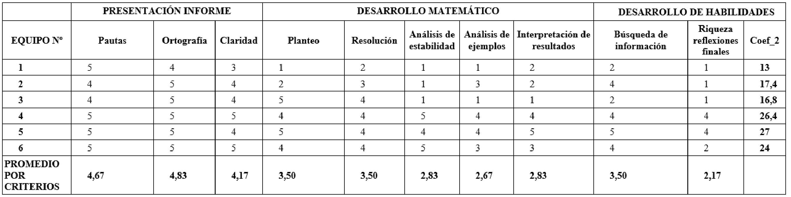 En el coeficiente de valoración 1, coef_1, que responde a la evaluación formativa informal, se evaluó el trabajo en equipo y la exposición oral de la resolución de las tareas propuestas clase a clase, con un máximo de 25 puntos. La escala de Likert utilizada fue: