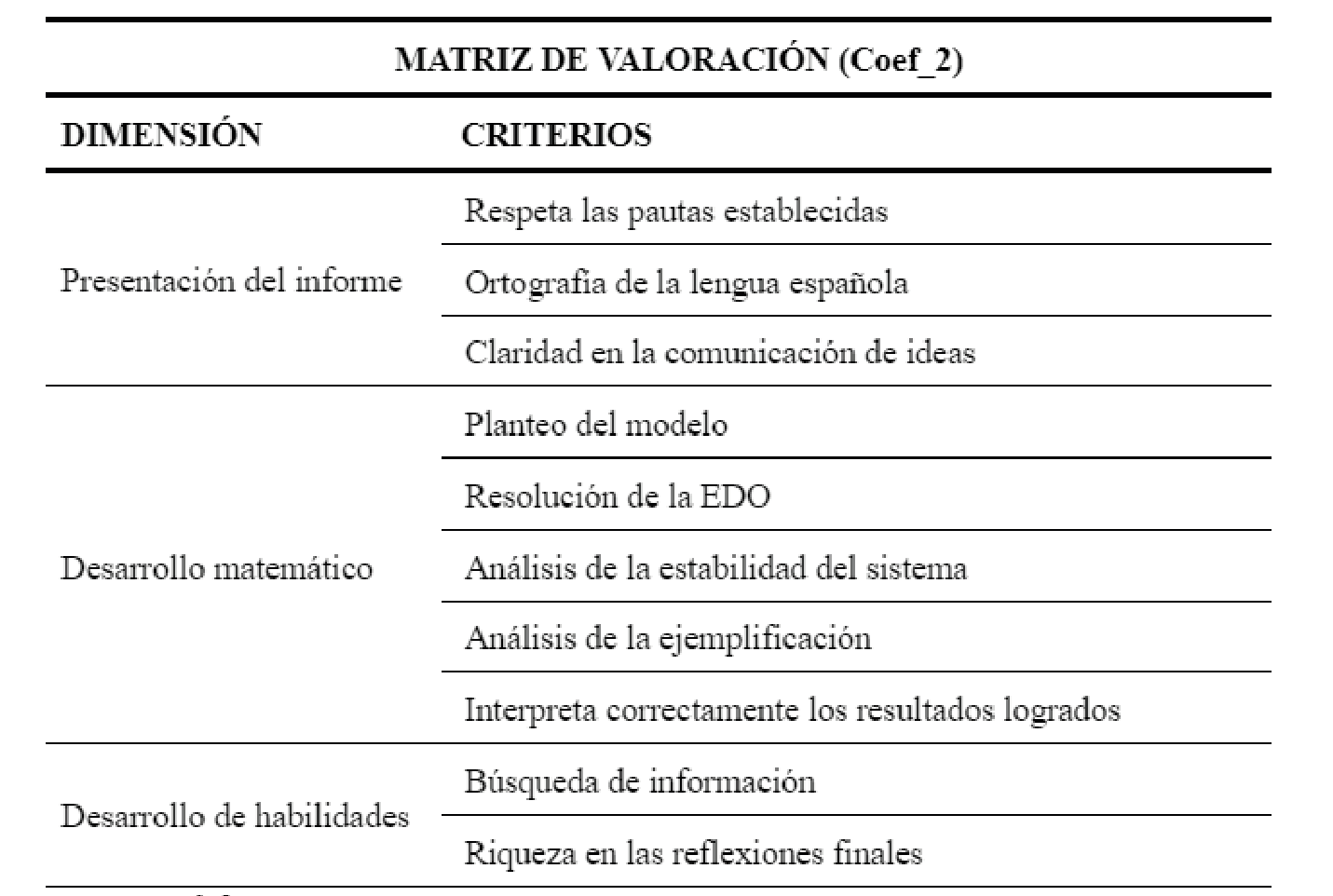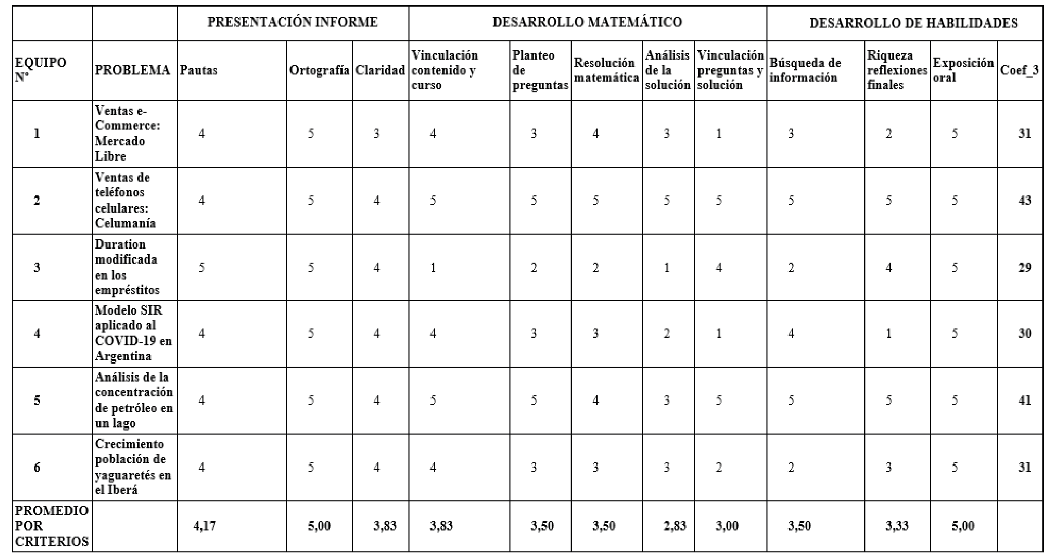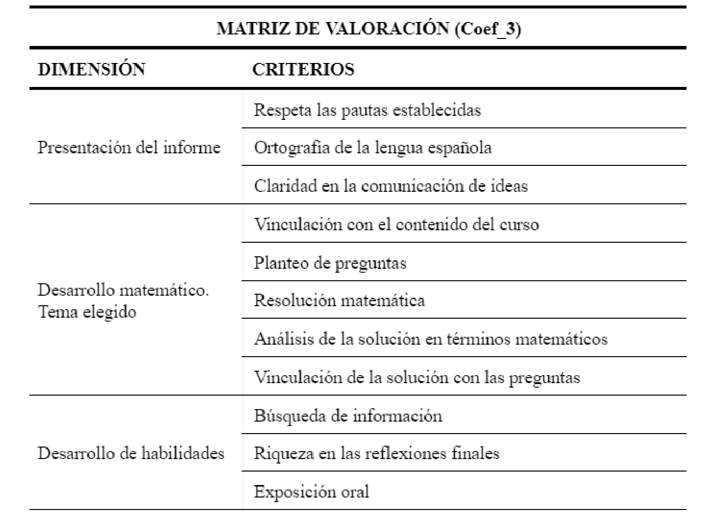 Por las características del tercer trabajo, la matriz de valoración del coeficiente 3 se modificó en la dimensión “desarrollo matemático”, evaluando la vinculación con el contenido del curso, el planteo de preguntas, la resolución matemática, el análisis de la solución en términos matemáticos y la vinculación de la solución hallada con las preguntas iniciales. El coeficiente de valoración 2, coef_2, con un máximo de 35 puntos, tuvo como finalidad valorar la capacidad de resolución de un mini caso prefijado por los docentes de un modelo matemático parametrizado.