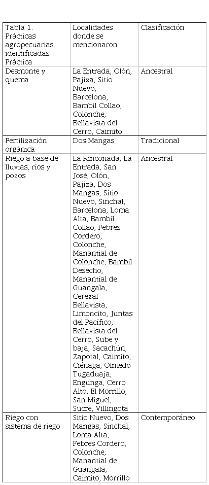 Se identificaron 16 prácticas agropecuarias, de las cuales diez se clasificaron como ancestrales, cinco fueron tradicionales y una práctica como contemporánea.