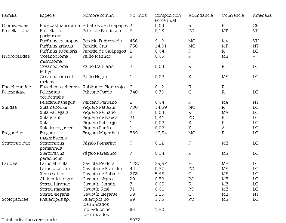 La composición de especies registradas durante esta investigación se caracteriza por la presencia de dos grupos de aves marinas: Las formas migratorias y residentes, (Tabla 1). Los residentes conforman un grupo de nueve especies cuyas colonias de nidificación son islas dentro del espacio marino ecuatoriano. Las especies residentes Fregata magnifiscens, Pelecanus occidentalis, Phaethon aethereus, Sula, S. nebouxii . S. granti tienen colonias reproductivas en las islas de La Plata y Sta. Clara. Las especies residentes Phoebastria irrorata, Puffinus subalaris y Oceanodroma tethys se reproducen principalmente en las islas Galápagos.