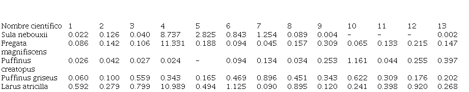 Otro grupo importante de aves marinas lo conforman las especies residentes que en este estudio contabilizan un total de nueve especies entre las cuales las más numerosas fueron Fregata magnifiscens y Sula nebouxii. Todas las especies residentes se distribuyen en aguas cálidas