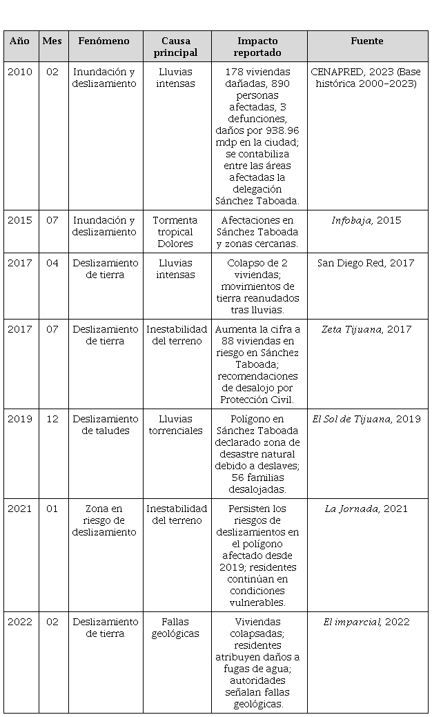 El Sol de Tijuana (2020) destacó que, desde el último tercio del siglo XX, familias desplazadas por inundaciones en la zona de canalización del río comenzaron a asentarse en Sánchez Taboada, y en 1985 recibieron títulos de propiedad. Sin embargo, esta medida no mejoró la situación de quienes fueron damnificados a largo plazo. Entre 2010 y 2022, estos asentamientos, que no consideran riesgos inherentes, registraron lluvias intensas, inundaciones y deslizamientos. En la Tabla 1 se recupera información disponible en bases oficiales y fuentes hemerográficas locales,5 lo que permite dimensionar el tipo, recurrencia, causa e impacto de estos fenómenos y contextualizar los riesgos que han persistido en la zona durante el presente siglo.