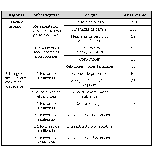 El análisis se organizó en torno a dos ejes principales: 1) el paisaje urbano y 2) los riesgos de inundación y movimientos de ladera, a partir de los cuales se definieron subcategorías que capturan dimensiones específicas de las experiencias, significados y prácticas comunitarias. En este apartado se presentan los trece códigos con mayor enraizamiento (repetición) que ilustran cómo las memorias colectivas y las estrategias de adaptación se entrelazan en el territorio (Tabla 2).