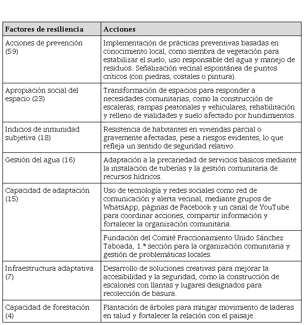 La Tabla 3 recoge las acciones comunitarias identificadas durante el trabajo de campo, organizadas en factores que fortalecen la resiliencia ante riesgos de inundaciones y movimiento de laderas.