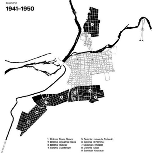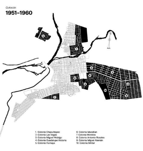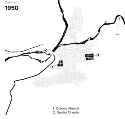 Para el censo de 1950, la población llegó a 48 963, con un aproximado de 9792 viviendas, un aumento de 5387 respecto al anterior. Esta cantidad prácticamente duplicó la mancha urbana y el número de casas. La ciudad contaba con once colonias, de las cuales tres eran residenciales: fraccionamiento Paseo Niños Héroes, Guadalupe y Lomas de Culiacán; y ocho colonias populares: Gabriel Leyva, Almada, Industrial Bravo, Popular, Tierra Blanca, El Vallado, Ejidal y El Palmito (Figura 6).