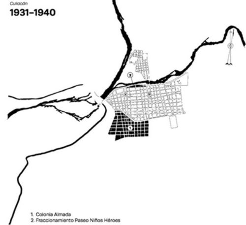 En 1940 la población llegó a 22 025, con alrededor de 4405 viviendas, un aumento de 765 respecto al censo de 1930. En 1938 había iniciado la construcción de la presa Sanalona, lo que presagiaba una notable expansión de la mancha urbana para los próximos años. Durante esta tercera década se terminó por consolidar la colonia Gabriel Leyva y se convirtió en uno de los sectores más dinámicos de la ciudad. En 1932 había empezado hacia el sur, más allá de las vías del Tacuarinero, la venta de terrenos de la colonia Almada (Figura 4).