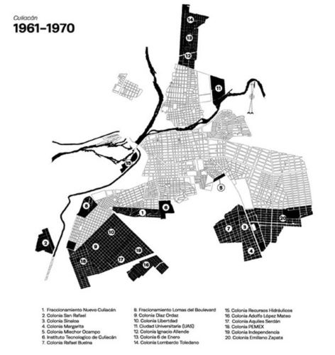 En el VIII Censo General de Población de 1960 Culiacán llegó a 84 024 habitantes y existían 17 044 viviendas, es decir, 7252 más que en 1950. En esta década se construyeron doce colonias, dos de ellas residenciales: la Chapultepec y las Quintas. El resto fueron colonias populares: Miguel Hidalgo, Guadalupe Victoria, Salvador Alvarado, Francisco Villa, Mazatlán, Rosales, Humaya, Las Vegas, Morelos, Burócrata y Miguel Alemán (Figura 7). En el sector oriente continuó el auge constructivo de los años cincuenta, impulsado por la pavimentación del bulevar Francisco I. Madero en 1954, el cual se convirtió en la Carretera Internacional México-Nogales al cruzar por la ciudad.