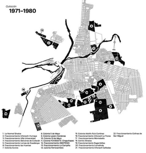 Para mostrar con mayor claridad la importancia de la vivienda popular en el crecimiento urbano de Culiacán se delimitó el número que surgió cada diez años, así como el de la vivienda residencial. Las fuentes de información son los datos de los Censos de Población de 1921 a 1980 y el reconocimiento oficial de cada una de las colonias populares por parte del Ayuntamiento, recuperado de las Actas de Cabildo en el AHMC. Se cruzó esta información para encontrar los sectores de la ciudad donde se construyeron estas viviendas.
