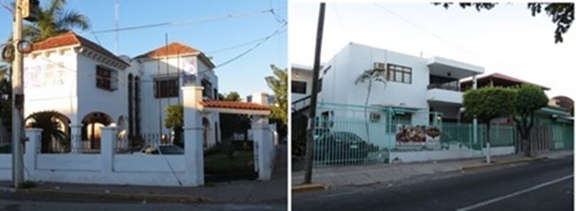 Estas dos colonias, junto con algunas manzanas del sector oriente cercanas a la Caseta Cuatro, fueron las zonas de la ciudad donde se ubicaron la mayoría de las 765 viviendas surgidas en la década de los treinta. El fraccionamiento Paseo Niños Héroes se constituyó oficialmente en 1939, pero la etapa de construcción de sus viviendas fue durante los años cuarenta. En este lugar se construyeron las primeras viviendas del funcionalismo mexicano y algunas con estilo neocolonial (Figura 5), puesto que en los primeros años de la década de los cuarenta aún prevalecía el espíritu nacionalista impulsado por los gobiernos posrevolucionarios.