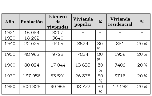 En Culiacán, la primera colonia popular surgió en 1924 y para 1970 existían más de 50, casi todas de manera irregular sobre terrenos ejidales. Se estima que el 80 % de las viviendas construidas en Culiacán durante la primera mitad del siglo XX fue a través de la autoconstrucción o autogestión. Esta consideración, junto con el crecimiento poblacional, permite realizar un análisis cuantitativo de las viviendas populares que se edificaron cada diez años (Tabla 1).
