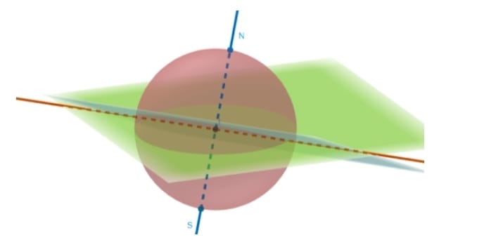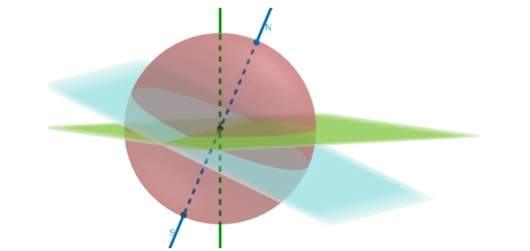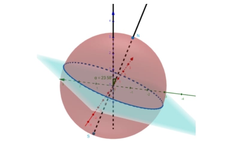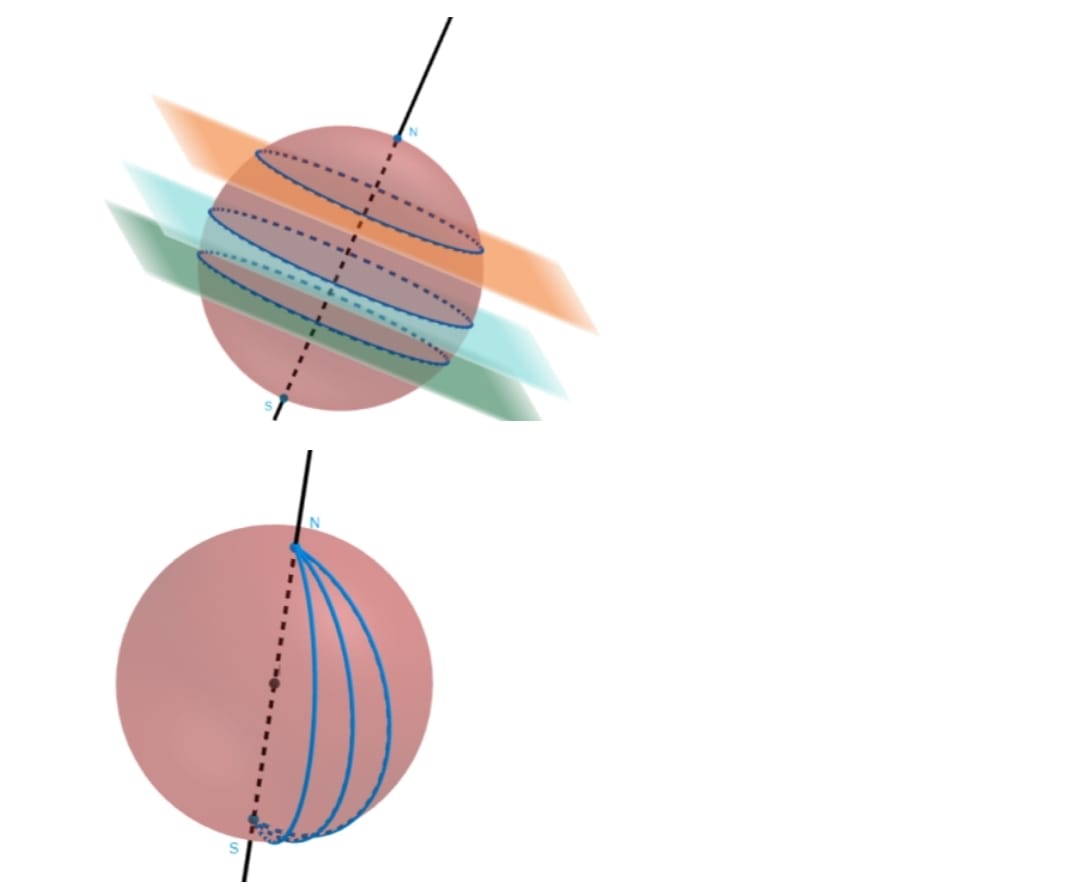 Ou seja, a esfera que representa a Terra tem raio igual a 3. É necessário apontar que os planos perpendiculares às retas, forem plotados no software utilizando a ferramenta de ponto e reta perpendicular ao plano. Sendo o ponto do plano, o centro da esfera utilizada como Terra (origem do espaço tridimensional). Conforme explicitado, o plano formado é perpendicular ao eixo de rotação da terra e passa pela origem do espaço tridimensional. Sendo a linha que faz um ângulo de 23° com o eixo de rotação, seja a reta em cima do eixo das cotas (eixo z). Com isso, podemos fazer alusão novamente ao plano equatorial mencionado acima e mencionar as divisões imaginárias da Terra: “Todos os planos, paralelos ao Equador Terrestre, que interceptarem a superfície terrestre definirão circunferências chamadas Paralelos Geográficos” (BOCZKO, 1984, p.52), ilustrados pela Figura 7. Assim, como “As semi-circunferências centradas no centro da Terra e passando pelos polos da Terra determinam os Meridianos Geográficos” (BOCZKO, 1984, p.52).