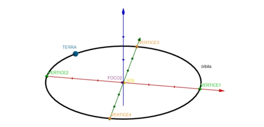 Se achar conveniente, o docente responsável poderá pedir para que os alunos calculem essa interseção, através do software, pedindo a interseção dos dois planos e aproveitando para comentar que toda interseção de dois planos se caracteriza geometricamente como uma reta. Ou seja, uma reta que passa na origem do espaço tridimensional e que tem grande importância, pois é considerada, segundo Silva (2006, p.14) “chamada linha dos equinócios”. Pois, quando sobrepostos a linha e o plano da eclíptica, os equinócios ocorrem justamente nas interseções destes (ou seja, nos vértices do eixo maior – vértices 1 e 2, como ilustrado na Figura 11). Já os solstícios acontecem sempre que o movimento da órbita da Terra atinge os vértices do eixo menor (vértices 3 e 4) da elipse orbital, como mostrado também na Figura 11. O encerramento do roteiro poderá ser dado com as dúvidas que ainda possam surgir com os discentes e ainda procurando saber a opinião desses quanto ao conteúdo abordado e o modo como foi aplicado. Deixa-se claro que a recepção dos alunos frente ao assunto abordado é de grande valia e serve como termômetro para momentos como esse. Fica ainda como sugestão a possibilidade de ampliação deste roteiro para abordar projeções geográficas e distorções, fazendo conexões com planos bidimensionais e espaços tridimensionais. E, ainda, ao abordar o conteúdo de translação, comentar sobre a influência da órbita elíptica sobre as estações do ano