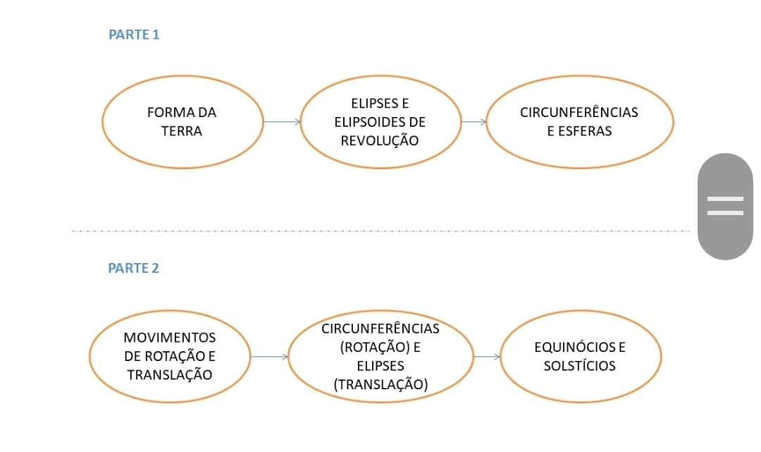 Como explicitado na Figura 1, o roteiro estará dividido em duas partes: • Parte 1: relação da forma da Terra com o elipsoide de revolução, sendo obtido através da revolução de uma elipse sobre uma reta qualquer. Incluindo também a simplificação do formato da Terra através da superfície esférica; • Parte 2: caracterização dos movimentos de rotação e translação da terra com as circunferências e elipses e como podem ser explicados os fenômenos geográficos a partir dessa perspectiva, esmiuçando o solstício e o equinócio. As ferramentas digitais serão de grande importância nessa proposta pedagógica, sendo utilizado o software Geogebra no seu modo clássico, por ser de fácil acesso a qualquer computador conectado à internet. O uso dessa ferramenta se deu principalmente para que os alunos possam visualizar os conceitos aqui abordados, por se tratarem principalmente de ideias tridimensionais. Procura-se, assim, de acordo com Trindade (2008, pg. 82), “uma desconstrução, uma ruptura com o tradicional e com o cotidiano tarefeiro escolar”, almejando uma região de fronteira entre as regiões das duas disciplinas, onde uma convive com a outra sem invadir espaços, permitindo o diálogo e compartilhamento de conhecimentos.
