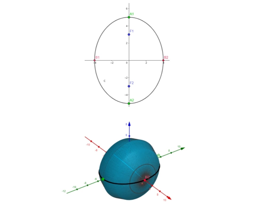 Valendo-se sempre da proposta interdisciplinar mencionada anteriormente, o(a) professor(a) poderá, em um primeiro momento, lançar questionamentos à turma sobre a forma do planeta em que vivemos e também de seus movimentos característicos. Até mesmo pedir para ver fotos e ilustrações, indagando aos alunos sobre seus conhecimentos prévios sobre o tema a ser abordado. Procurando, assim, investigar se os alunos tem ciência das relações (em qualquer grau) entre aspectos astronômicos e matemática. O formato da Terra tem um aspecto complicado, quando lidamos com uma aproximação ao conhecimento matemático, pois não assume os caracteres de um sólido geométrico conhecido. De acordo com Silva (2006, p. 2): Tendo em vista não ser fácil exprimir matematicamente a forma real da Terra, procurou-se interpolar um sólido que melhor se aproximasse dela. Em 1924, a União Internacional de Geodésia e Geofísica concluiu que a Terra poderia ser convenientemente representada por um certo elipsóide de revolução, que passou a ser designado como Elipsóide Internacional de Referência (EIR). O elipsóide de revolução abordado neste trabalho, é a revolução de uma elipse (já comentada anteriormente) em torno de uma reta qualquer, se caracterizando como uma superfície de revolução. Ou seja, o(a) professor(a) fará alusão a conceitos já conhecidos pelos alunos (elipses e superfícies de revolução) para trabalhar o formato da Terra. Na Figura 2.a, temos a representação de uma elipse de Equação 8 e em 2.b um elipsóide de revolução, feito através da revolução da elipse sobre o eixo das abscissas (eixo x) no software Geogebra. A partir deste momento, consideraremos que todas as figuras mencionadas foram plotadas neste software.