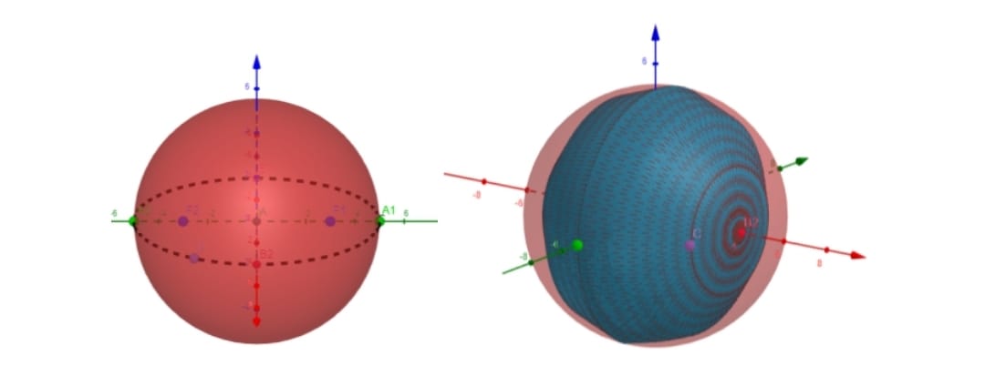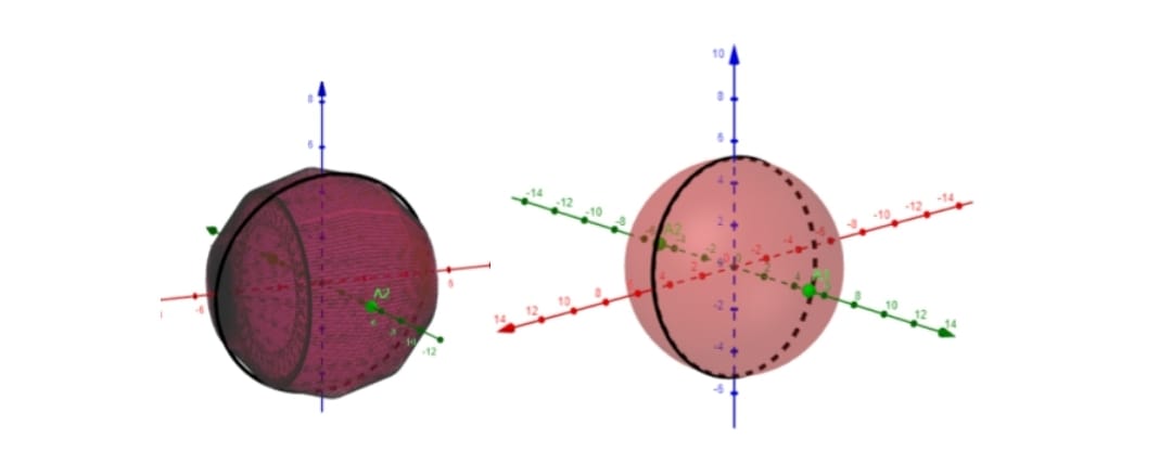Dessa forma, o(a) professor(a) poderá apontar que o formato da Terra poderá ser estimado através da revolução de uma elipse sobre uma reta qualquer, ocasionando o elipsoide de revolução (uma superfície de revolução, já comentada anteriormente). No caso do exemplo apresentado, pode-se destacar que a elipse em questão tem eixo maior paralelo ao eixo das ordenadas (eixo y) centro na origem do plano cartesiano e focos nos pontos (0,3) e (0,-3), vértices do eixo maior localizados nos pontos (0,5) e (0,-5) e vértices do eixo menor localizados nos pontos (4,0) e (-4,0). Foi escolhido o centro como origem do plano para facilitar a equação de elipse formada. É importante também destacar que a elipse está formada no plano bidimenisonal, enquanto que a superfície elipsóide está formada no espaço tridimensional. O elipsoide em questão tem suas interseções com os eixos x, y e z localizados nos pontos (4,0,0), (-4,0,0), (0,5,0), (0,-5,0), (0,0,5) e (0,0,-5), dadas justamente pelo comprimento da revolução ter valor absoluto 5 (comprimento da metade do eixo maior) e 4 (comprimento da metade do eixo menor). Para maior aprofundamento, o(a) professor(a) poderá ainda mencionar sobre a dedução de uma equação geral de elopsoide de revolução, utilizando a elipse original. Ainda de acordo com Silva (2006), é possível admitir uma simplificação da forma da Terra para minimização dos cálculos, podendo adotar assim um formato esférico para representação. Na Figura 3.a, podemos visualizar a elipse de Equação 8 e uma superfície esférica de Equação 9, de mesmo centro e raio 5 (comprimento da metade do eixo maior da elipse). Já na Figura 3.b é ilustrada a comparação do elipsoide 2.b e a superfície esférica, dando respaldo ao que foi citado sobre a simplificação do formato da Terra para uma superfície esférica – com erros de aproximações relativamente pequenos.
