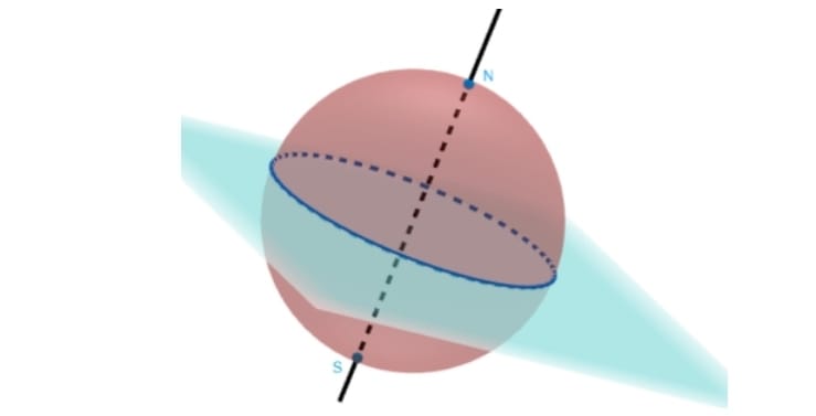 Para o início dos estudos dos movimentos da Terra e dessa em relação ao Sol, é preciso primeiro atentar para os planos e eixos de referências utilizados. Em concordância com Silva (2016, p.2), “A Terra possui um eixo de rotação, cujas extremidades constituem os polos verdadeiros ou geográficos, Norte (N) e Sul (S).” Secionando a esfera da Terra no meio com um plano perpendicular ao eixo de rotação, temos a divisão desta nos hemisférios Norte e Sul. Ainda de acordo com Silva (2016), esse plano é chamado de Plano Equatorial e ao fazer a interseção desse plano com a esfera da terra, obtemos uma circunferência que representa o equador, como observado na Figura 5 abaixo: