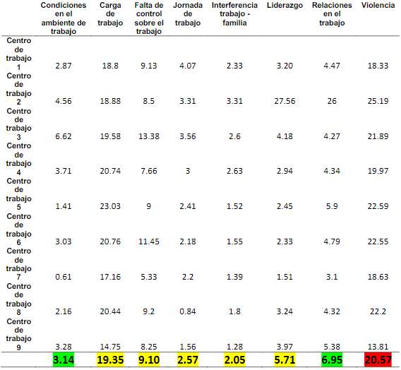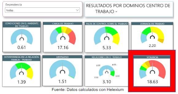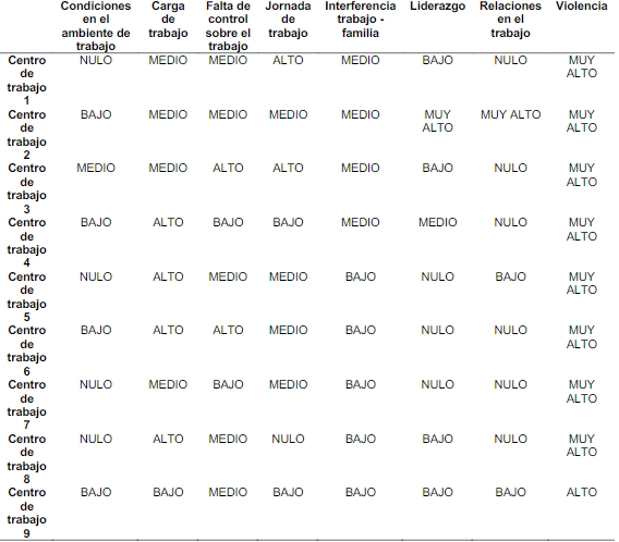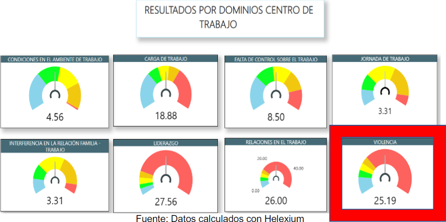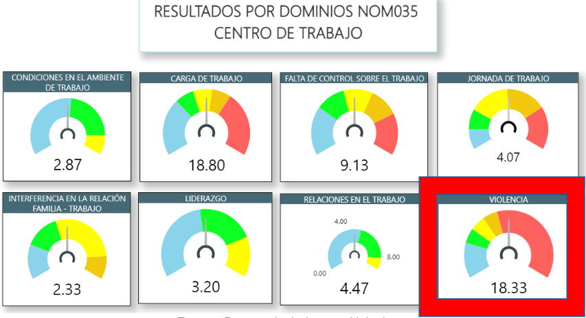 Los resultados de las evaluaciones para la identificación y análisis de los factores de riesgos psicosociales provenientes de la Guía de referencia II de la NOM-035-STPS-2018 aplicadas a 284 trabajadores de 9 diferentes centros de trabajo y además de diferentes giros, demostraron que la violencia laboral es un problema verdaderamente preocupante en los centros de trabajo de nuestro país. De hecho, se puede observar que dentro de los dominios evaluados en la multicitada guía, es el único que tiene resultado MUY ALTO según la tabla 5, ya que los demás se encuentran 2 en riesgo bajo y 5 en riesgo medio.