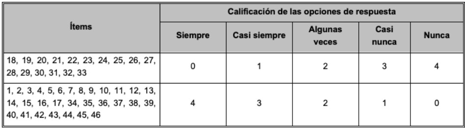 Y para los reactivos 34, 35, 36, 37, 38, 39 y 40 la ponderación se invierte, y se mide así: cuando se responde siempre el valor es 4 (cuatro), casi siempre 3 (tres), algunas veces 2 (dos), casi nunca 1 (uno) y nunca 0 (cero).