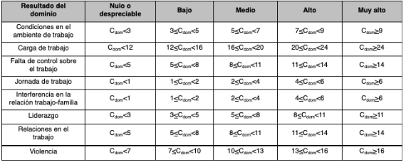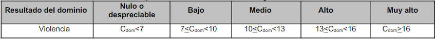 Como se puede observar en la figura 1, es posible obtener 5 probables niveles de riesgo una vez que se obtienen los resultados de las evaluaciones. Para determinar el nivel de riesgo correspondiente de violencia laboral, la NOM-035-STPS-2018 proporciona parámetros mediante la Guía de referencia II, que se pueden observar en la siguiente tabla, importante señalar que Cdom significa Calificación del dominio: