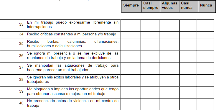 Las preguntas correspondientes a violencia laboral las podemos observar en la siguiente tabla: