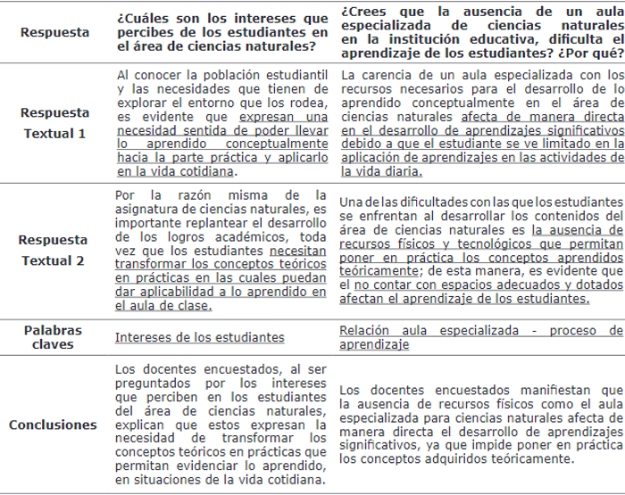 • Los docentes, al ser encuestados por los intereses que perciben en los estudiantes del área de ciencias naturales, explican que estos expresan la necesidad de transformar los conceptos teóricos en prácticas que permitan evidenciar lo aprendido en situaciones de la vida cotidiana.