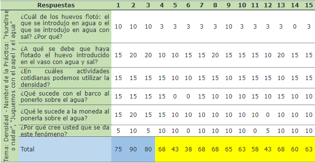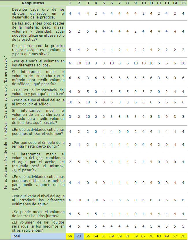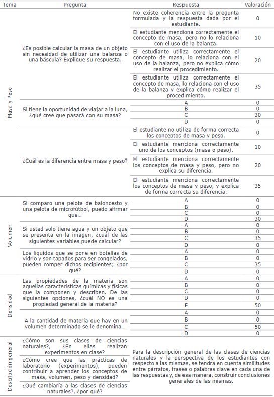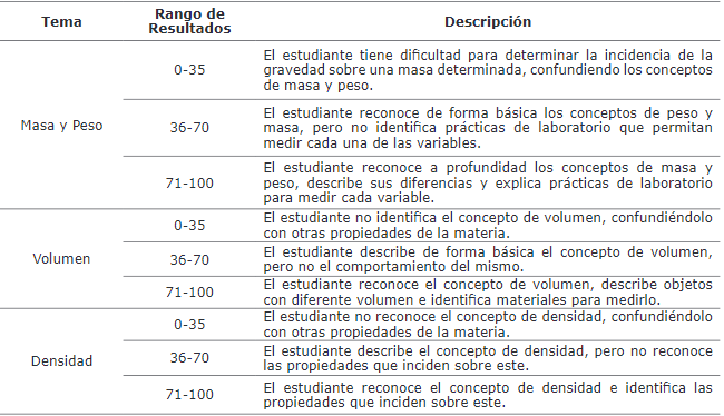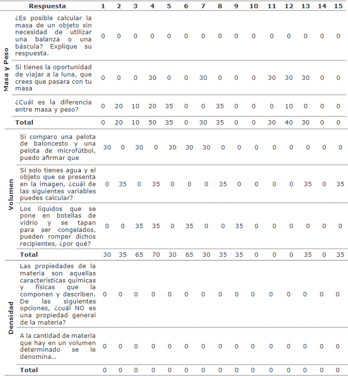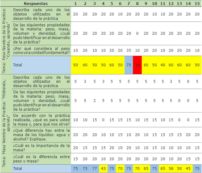 A continuación, se relaciona la ponderación de cada una de las respuestas dadas por los estudiantes encuestados, la cual se hizo teniendo en cuenta la rúbrica de evaluación propuesta, referente al plan de procesos y desarrollo metodológico. Las preguntas fueron divididas según el tema (masa y peso, volumen, densidad) y, codificadas cuantitativamente, considerando una ponderación de 0 a 100. El resultado de dichas calificaciones se relacionó con lo expuesto en la Tabla 2, referente a la rúbrica para análisis de resultados de la actividad diagnóstica de estudiantes, en la cual se describe tres rangos de resultados: 0-35 (color rojo); 36-70 (color amarillo) y, 71-100 (color azul). Además, se caracterizó algunas preguntas referentes a la descripción general de las clases de ciencias naturales, las cuales fueron codificadas cualitativamente, identificando similitudes entre párrafos, frases o palabras clave en cada una de las respuestas; de esa manera, se construyó las conclusiones generales de las mismas.