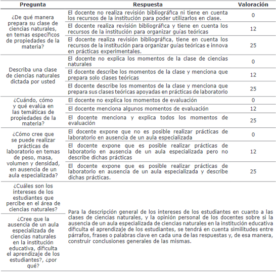 En esta fase también se relacionó el segundo objetivo específico, donde se diseñó una encuesta de seis preguntas abiertas en un formulario de Google forms, aplicada a dos docentes del área de ciencias naturales. A continuación, se relaciona la ponderación de cada una de las respuestas dadas, teniendo en cuenta la rúbrica de evaluación propuesta, referente al plan de procesos y desarrollo metodológico. Las preguntas fueron divididas según la descripción de las clases de ciencias naturales y codificadas cuantitativamente, con una ponderación de 0 a 100. Referente a la rúbrica para análisis de resultados de la entrevista a docentes, además, se caracterizó algunas preguntas referentes a la percepción de gustos de estudiantes y opinión en cuanto a las prácticas experimentales en el área de ciencias naturales, las cuales fueron codificadas cualitativamente, identificando similitudes entre párrafos, frases o palabras clave en cada una de las respuestas; de esa manera, se construyó las conclusiones generales de las mismas.