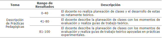 En seguida, se relaciona la ponderación de cada una de las respuestas dadas por los estudiantes, teniendo en cuenta la rúbrica de evaluación propuesta referente al plan de procesos y desarrollo metodológico, las cuales fueron codificadas cuantitativamente, con una ponderación de 0 a 100. El resultado se relacionó con lo expuesto, concerniente al análisis de resultados de las preguntas de las prácticas experimentales, en la cual se describe tres rangos de resultados: 0-35 (color rojo), 36-70 (color amarillo) y 71-100 (color azul).