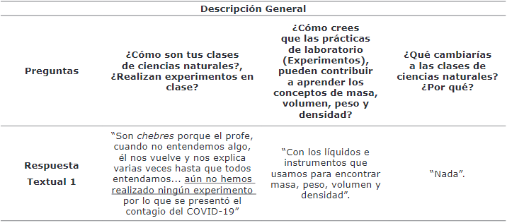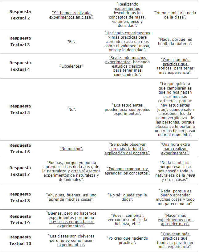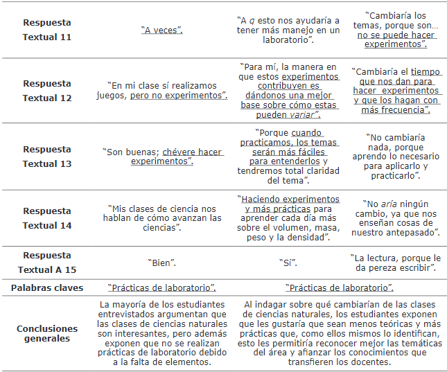 • La mayoría de los estudiantes entrevistados argumentan que las clases de ciencias naturales son interesantes, pero además exponen que no se realizan prácticas de laboratorio debido a la falta de elementos.