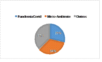 Já com relação ao objeto principal deste artigo, identificamos que 34% das postagens estão relacionadas ao meio-ambiente, aos trabalhos desenvolvidos por ele na Frente Parlamentar Ambientalista, mensagens sobre povos indígenas, Amazônia, Pantanal e críticas à atuação do Ministro Ricardo Salles.