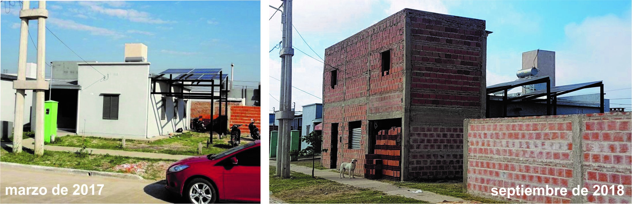 La implementación de los SFCR en estas 5 viviendas se realizó replicando el modelo “llave en mano” en el otorgamiento de las instalaciones fotovoltaicas, lo que dio como resultado un compromiso variado por parte de los destinatarios. Por ejemplo, uno de los vecinos construyó una ampliación que obstaculiza la radiación solar sobre el arreglo fotovoltaico comprometiendo seriamente su funcionamiento, como puede observarse en la figura 3.