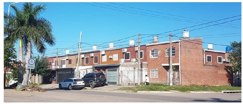 En la Figura 4 se observa la situación del barrio en la actualidad. Si bien existen ampliaciones de los vecinos, incorporación de especies arbóreas, presencia de cables, etc., la posibilidad de considerar el techo del segundo nivel para la incorporación de un SFCR es favorable además del retroceso de la línea municipal que aleja la incidencia de las sombras de elementos y forestación urbana.